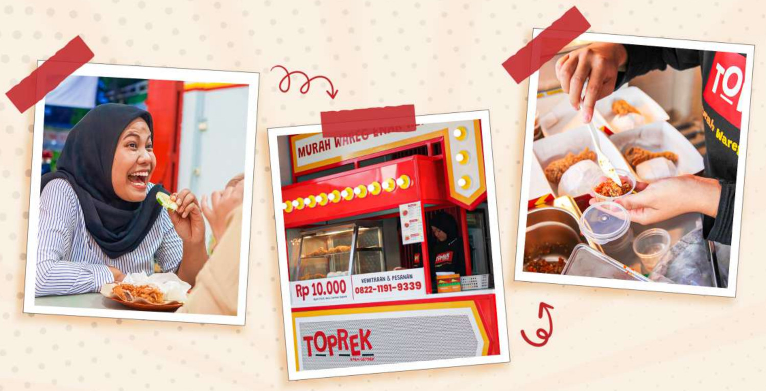 Paket kemitraan Toprek adalah paket lengkap dimana sudah termasuk rombong, peralatan, perlengkapan, dan bahan baku yang dibutuhkan untuk menjalankan usaha. Didukung dengan SOP dan Training yang mudah dipahami oleh mitra untuk menjalankan bisnis.